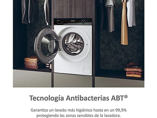 La puerta de la lavadora siempre cerrada puede padecer por la humedad y provocar la formación de moho y bacterias. La Tecnología ABT en la junta de la lavadora evita que las bacterias, gérmenes nocivos crezcan y se multipliquen, provocando olores además de residuos desagradables y gracias a la tecnología en la junta, la lavadora se mantiene siempre limpia.