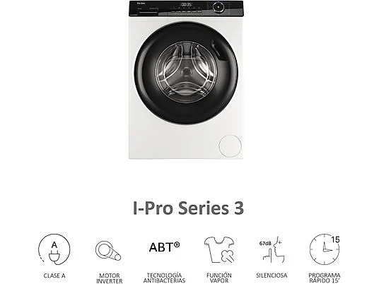 Lavadora carga frontal – Haier I-Pro Series 3 HW90-BP14939-S, 9kg, 1400rpm, Motor Inverter, Vapor, Antibacterias, Blanco